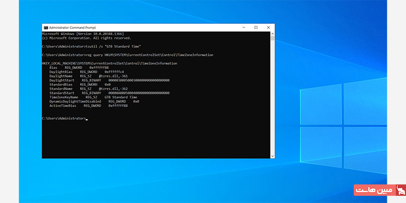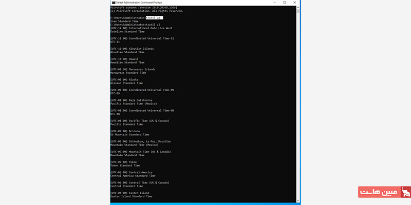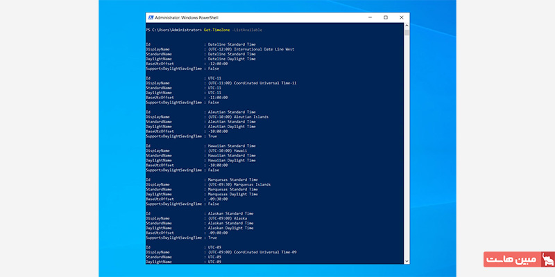 ۴. از بین لیست مناطق زمانی، منطقه مورد نظر خود را انتخاب کرده و نام استاندارد آن را در دابل کوتیشن قرار دهید. سپس دستور زیر را وارد کنید: