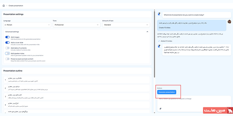 در کادری که در بالای صفحه مشاهده میکنید به زبانی که میخواهید پاورپوینت شما به آن زبان ایجاد شود پرامپت مورد نظر خود را بنویسید. برای مثال: «یک پاورپوینت 10 اسلایدی با موضوع «فایروال چیست» برای مبین هاست بساز. اسلاید ۱ مقدمه، اسلاید ۲ تا ۹ بدنه و اسلاید ۱۰ نیز جمع بندی و تشکر باشد.»