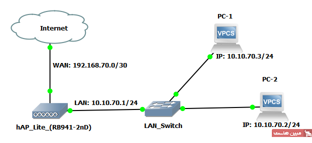 در دیاگرام بالا، یک روتر بیسیم hAP lite MikroTik بهعنوان یک دروازه LAN و WiFi AP استفاده میشود. این روتر بیسیم، دارای یک رابط WLAN و ۴ رابط اترنت (Ethernet) است. برای اتصال دستگاههای بیسیم، WiFi AP بر روی WLAN ایجاد میشود.