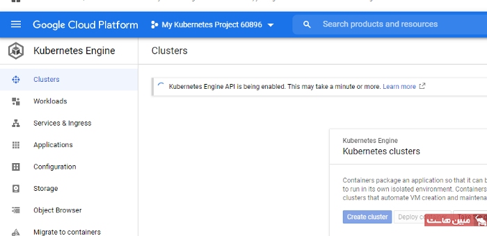 مانند تصویر زیر، بررسی کنید که آیا پیام «Kubernetes engine API is being enabled» ظاهر میشود یا خیر.