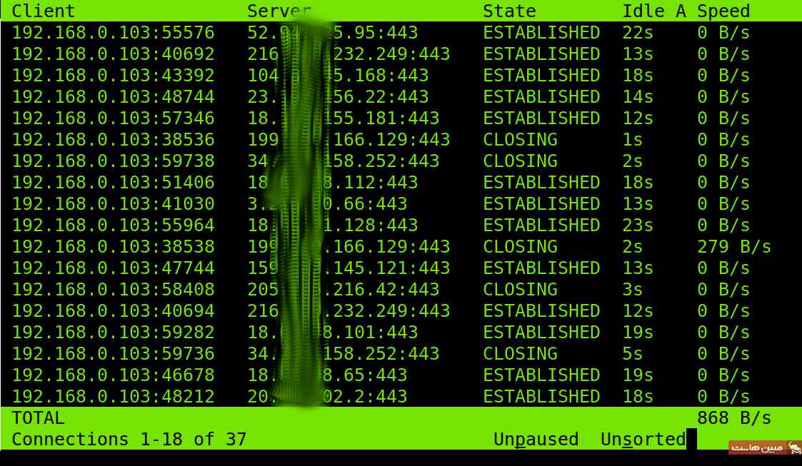 پس از اجرای دستور بالا، خروجی اتصالات که شامل آدرس و پورت محلی (ستون اول)، آدرس و پورت ریموت (ستون دوم)، وضعیت اتصال شبکه (ستون سوم)، زمان idle (ستون چهارم و سرعت هر اتصال (ستون پنجم) نمایش داده میشوند.